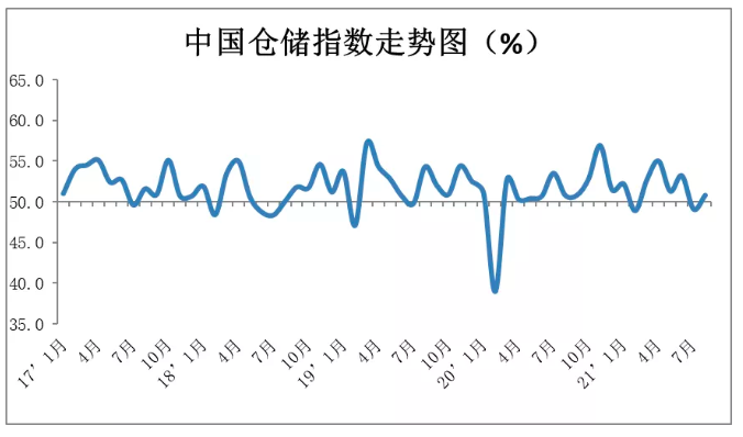 中國物流與采購聯(lián)合會發(fā)布的2021年8月份中國物流業(yè)景氣指數(shù)為49.5%,較上月回落0.8個百分點;中國倉儲指數(shù)為50.8%,較上月回升1.7個百分點。