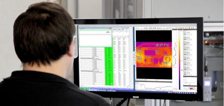 在第一站,通過新開發(fā)的機器人進行檢測。在此處測試熱連接,例如電力電子設備與冷卻表面或冷卻元件之間的連接。熱成像儀可測定多達10個已安裝功率半導體的熱特征。相應的測試圖像顯示,所有組件是否正確安裝及起作用。