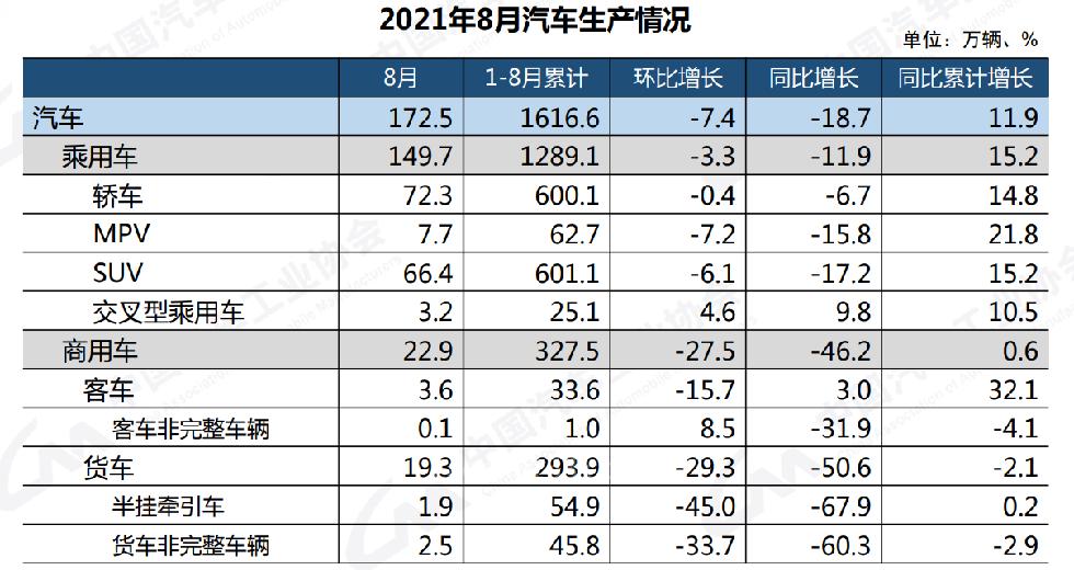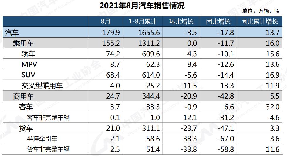 其中,乘用車8月產(chǎn)銷149.7萬輛和155.2萬輛,產(chǎn)量環(huán)比下降3.3%,銷量環(huán)比持平,產(chǎn)銷同比分別下降11.9%和11.7%。