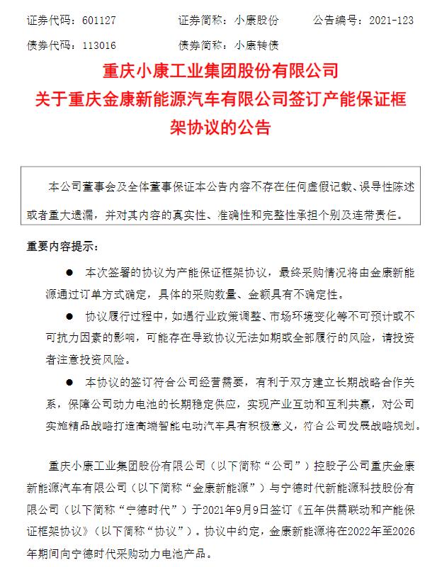 金康新能源與寧德時(shí)代簽訂《五年供需聯(lián)動(dòng)和產(chǎn)能保證框架協(xié)議》;小康股份公告截圖