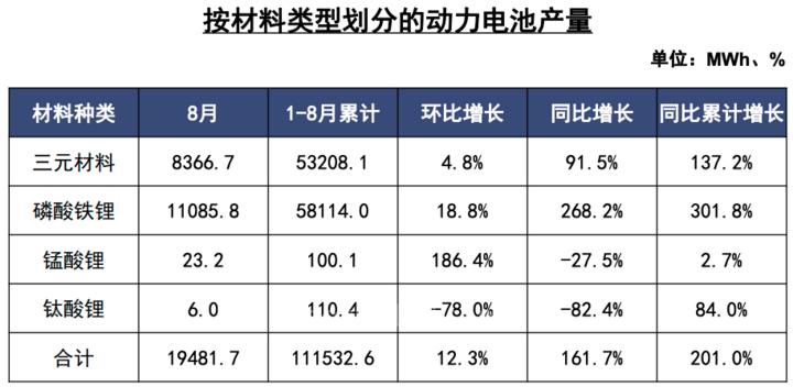8月,我國(guó)動(dòng)力電池產(chǎn)量共計(jì)19.5GWh,同比增長(zhǎng)161.7%,環(huán)比增長(zhǎng)12.3%。其中三元電池產(chǎn)量8.4GWh,占總產(chǎn)量42.9%,同比增長(zhǎng)91.5%,環(huán)比增長(zhǎng)4.8%;磷酸鐵鋰電池產(chǎn)量11.1GWh,占總產(chǎn)量56.9%,同比增長(zhǎng)268.2%,環(huán)比增長(zhǎng)18.8%。