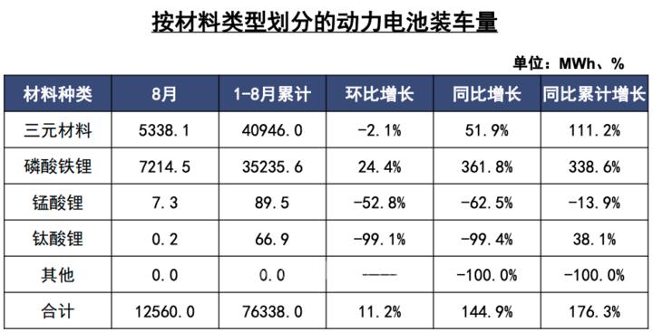 前8月,我國(guó)動(dòng)力電池裝車(chē)量累計(jì)76.3GWh,同比累計(jì)上升176.3%。其中三元電池裝車(chē)量累計(jì)40.9GWh,占總裝車(chē)量53.6%,同比累計(jì)上升111.2%;磷酸鐵鋰電池裝車(chē)量累計(jì)35.2GWh,占總裝車(chē)量46.2%,同比累計(jì)上升338.6%。