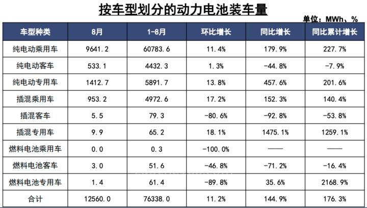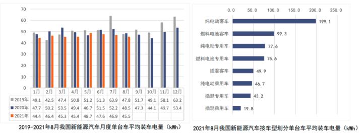 8月,我國(guó)新能源汽車(chē)按車(chē)型劃分的單車(chē)平均裝車(chē)電量45.5kWh,環(huán)比下降3.0%。其中純電動(dòng)乘用車(chē)和純電動(dòng)客車(chē)單車(chē)平均帶電量分別為46.7kWh/輛和199.1kWh/輛,純電動(dòng)客車(chē)單車(chē)平均帶電量環(huán)比下降3.8%。