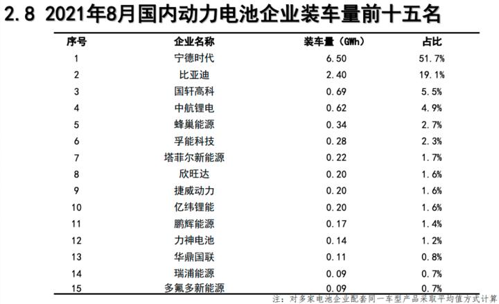 9月10日,中國(guó)汽車(chē)動(dòng)力電池產(chǎn)業(yè)創(chuàng)新聯(lián)盟發(fā)布2021年8月新能源汽車(chē)電池產(chǎn)銷(xiāo)量及裝車(chē)量數(shù)據(jù)。8月,寧德時(shí)代裝車(chē)量6.5GWh,市占率進(jìn)一步提升達(dá)51.7%,穩(wěn)坐冠軍寶座。比亞迪裝車(chē)量1.9GWh穩(wěn)居第二,國(guó)軒高科超越中航鋰電躋身第三,蜂巢能源超越億緯鋰能躋身第五。