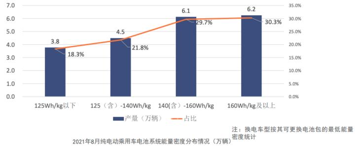 8月,我國(guó)純電動(dòng)乘用車(chē)系統(tǒng)能量密度在140(含)-160Wh/kg與160Wh/kg及以上車(chē)型產(chǎn)量占比分別為29.7%和30.3%。受磷酸鐵鋰車(chē)型放量帶動(dòng),125(含)-140Wh/kg車(chē)型產(chǎn)量占比提升,由7月的17.1%上升至21.8%。