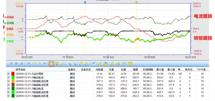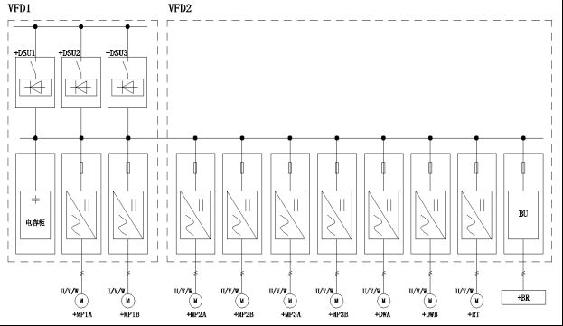 3) 整個(gè)驅(qū)動(dòng)系統(tǒng)使用GD800工程型變頻系列產(chǎn)品,采用二極管整流,共直流母線方案。