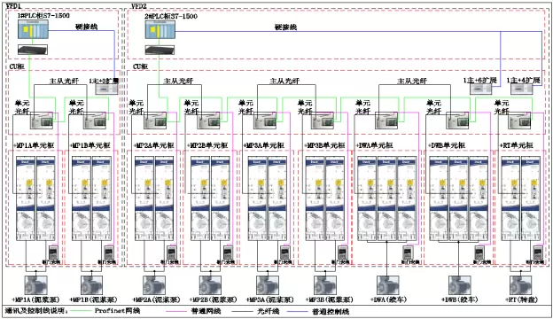 1)單元與控制盒之間采用光纖通訊,兩臺(tái)逆變柜之間主從也采用光纖通訊,傳輸速率高,每組泥漿泵、絞車A/B之間均采用主從方式控制。
