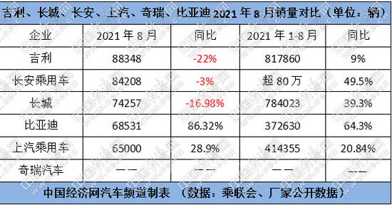 盡管“自主三強(qiáng)”在開(kāi)拓海外市場(chǎng)時(shí)都發(fā)出了不小的“聲量”,但受零部件供應(yīng)量銳減等因素影響,三家企業(yè)在8月的銷量均出現(xiàn)不同程度的下滑。相比之下,被視作“潛力股”的比亞迪和上汽乘用車,在8月以高速增長(zhǎng)的態(tài)勢(shì),縮小著與“自主三強(qiáng)”的差距。