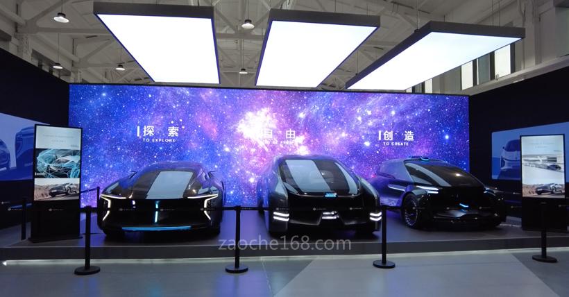 在緊挨著生產車間的高合體驗中心,進門左手視線盡頭,是3輛整排列的采用強科技感暗夜黑的概念車。全玻璃流線型車頂,延續(xù)了高合品牌巨大的進氣格柵設計,還有夸張而且大膽的車燈設計風格。