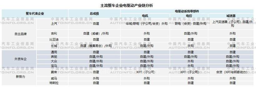 電驅(qū)動(dòng)系統(tǒng)作為新能源汽車的核心部件,同時(shí)收到了大部分整車企業(yè)的關(guān)注,整車企業(yè)在電驅(qū)系統(tǒng)布局模式方面主要有兩大類:自建和外購(gòu)。
