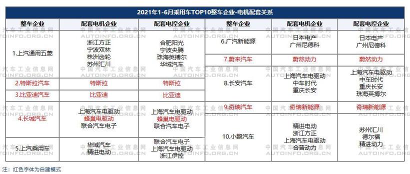 2021年上半年乘用車前十名的整車企業(yè)的電機(jī)配套商中,特斯拉、比亞迪、長(zhǎng)城汽車、蔚來(lái)汽車和奇瑞汽車等整車企業(yè)都有自建的配套商。
