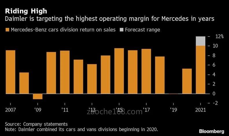 2007年以來梅賽德斯奔馳部門營業(yè)利潤率以及2021年預(yù)期利潤率(圖片來源:彭博社)