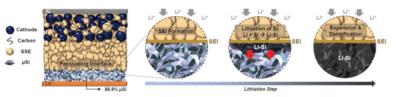 作為下一代電池產(chǎn)品——全固態(tài)電池是將電池正極和負極之間的電解質(zhì)從液態(tài)變?yōu)楣虘B(tài),相較現(xiàn)在主流的鋰離子電池具備更高能量密度、更高安全性的優(yōu)勢,可廣泛應用在新能源汽車、儲能領(lǐng)域。之前的全固態(tài)電池為了提高能量密度使用鋰金屬作為負極,但由于對溫度敏感,只能在60℃以上的高溫環(huán)境中充電,并且存在充電速度緩慢的技術(shù)瓶頸。為了突破這一難題,LG新能源研發(fā)團隊去除了全固態(tài)電池負極中的導電材料和膠粘劑,采用了5 um(微米)左右顆粒大小的"微硅負極材料"。