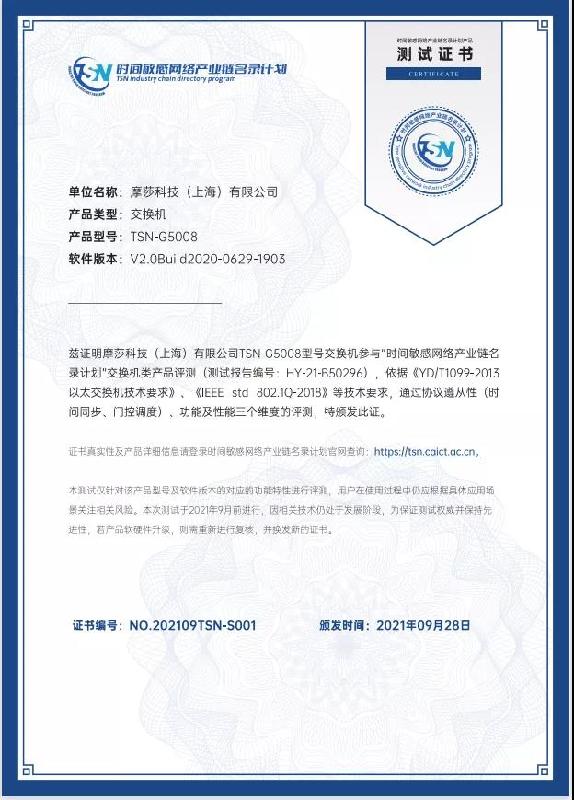 首批《時間敏感網(wǎng)絡(luò)產(chǎn)業(yè)鏈名錄計劃產(chǎn)品測試證書》在本次大會正式頒發(fā),Moxa 憑借突破性產(chǎn)品 TSN-G5008 以及一直以來在 TSN 領(lǐng)域的積累與探索,有幸獲得編號 001 的首張證書。