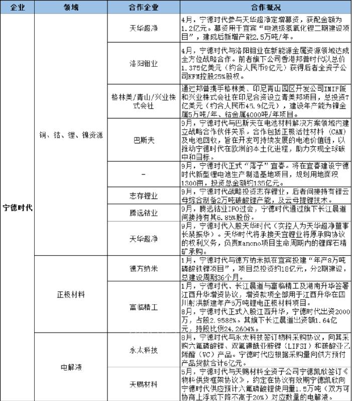 據(jù)不完全統(tǒng)計,寧德時代直接或間接參股的上游材料企業(yè)超過20家,通過控股、兼并購、深度綁定以加深對鋰電池上游原材料的掌控。