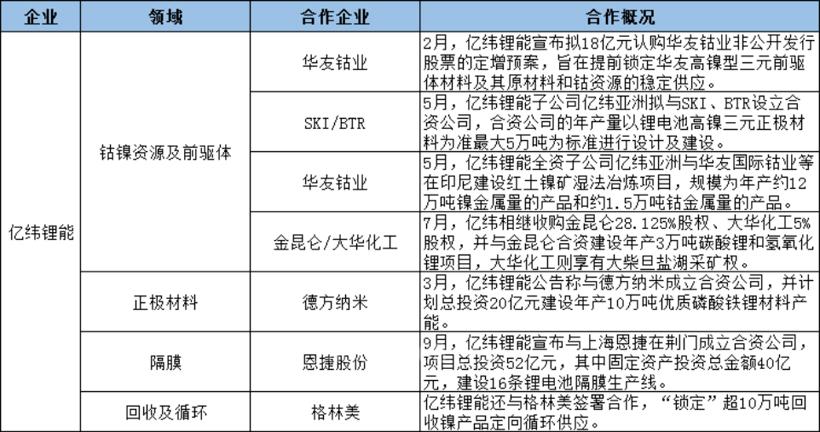 來看2021年以來,寧德時代、國軒高科、億緯鋰能等頭部動力電池企業(yè)的上游資源的加速布局: