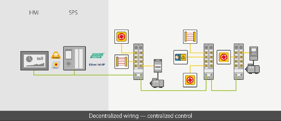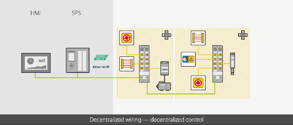 在集中式安全系統(tǒng)中,機器擴展可能要求進行復雜的接線以及額外的控制柜。而利用基于以太網(wǎng)的分布式安全技術,可在無控制柜的情況下持續(xù)實施模塊化概念。利用模塊化原理,機器和設備的擴展將顯著簡化。