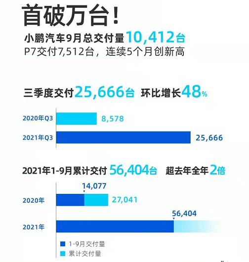 小鵬汽車9月總交付10,412臺(tái),為行業(yè)內(nèi)首個(gè)單月交付破萬(wàn)的新型車企,環(huán)比大增44%,同比增長(zhǎng)199%,連續(xù)15個(gè)月同比翻番。其中P7交付7,512臺(tái),這也是P7連續(xù)五個(gè)月創(chuàng)新高。