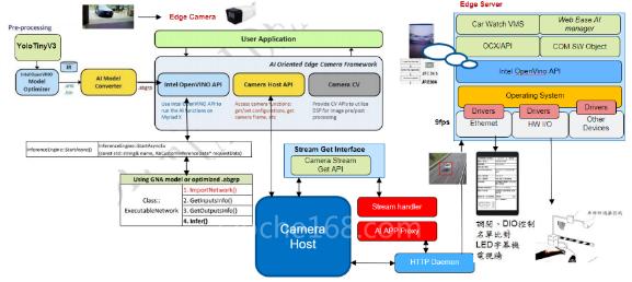 本方案中采用的Orbit AiCam是Orbit開發(fā)的一款車輛識(shí)別算法。其以AI深度學(xué)習(xí)的基本架構(gòu)為基礎(chǔ),并使用Intel? OpenVino toolkit? AI開發(fā)工具輔助加速。通過在裝有Intel? Movidius? Myriad? X加速器的AI Camera上運(yùn)行,可使攝像機(jī)具備AI偵測(cè)車輛與車牌位置的功能。