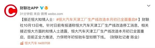 針對恒大汽車天津工廠生產(chǎn)線改造停工消息,接近恒大汽車的知情人士在接受財聯(lián)社采 訪時透露,恒大汽車天津工廠生產(chǎn)線改造本月初已全面重啟,目前正全力推進,力保明年初恒馳5如期下線。