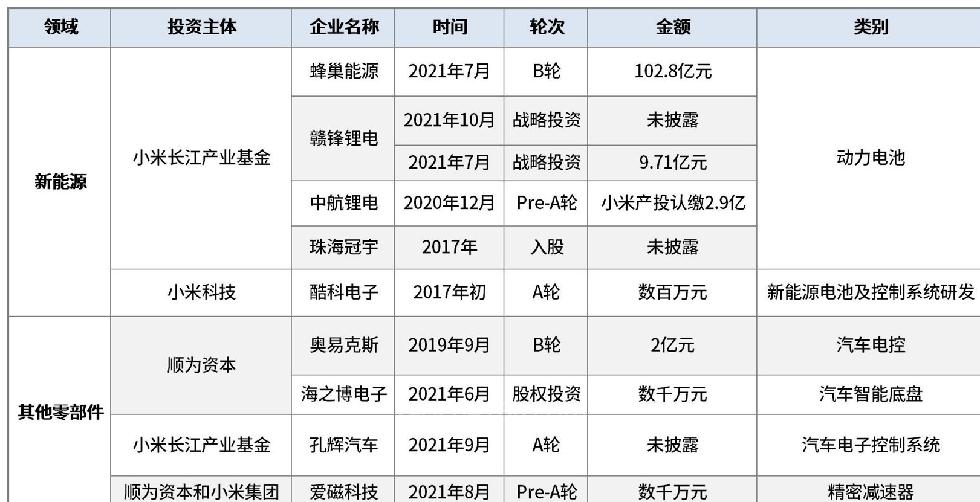 8月,蜂巢能源科技有限公司發(fā)生工商變更,新增小米長江產(chǎn)業(yè)基金等多名股東。而在7月底,小米參投了蜂巢能源102.8億元的B輪融資。