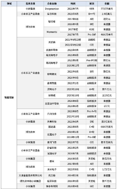 視覺傳感器領(lǐng)域,小米集團(tuán)于今年參投法國AI視覺公司普諾飛思C輪融資;小米產(chǎn)業(yè)基金投資了誠瑞光學(xué)和矽睿科技。在車載智能和智能座艙方面,就近兩年數(shù)據(jù)來看,小米參與過智能車載HUD研發(fā)商澤景電子和智能座艙開發(fā)商博泰車聯(lián)網(wǎng)的相關(guān)融資。