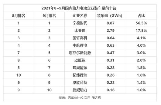 事實上,從剛剛發(fā)布的9月份國內(nèi)動力電池企業(yè)裝車量來看,一躍占據(jù)56.5%市場份額的寧德時代,用比8月份高出近5個百分點的增長,強勢捍衛(wèi)了自己的“王者地位”。