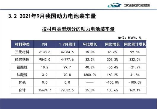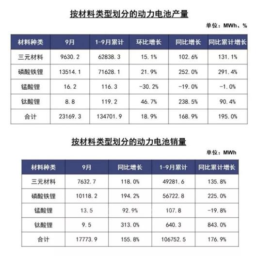 銷量方面,2021年9月,三元電池銷售7.6GWh,同比增長118.0%,占總銷量42.9%;磷酸鐵鋰電池銷售10.1GWh,同比增長194.2%,占總銷量56.9%。