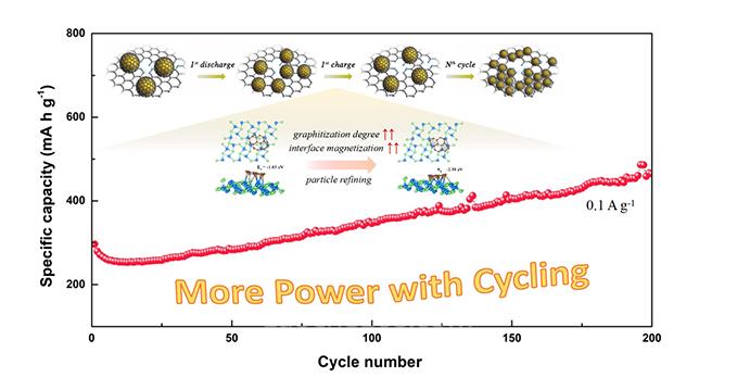 研究發(fā)現(xiàn),F(xiàn)eP納米顆粒在第一個(gè)循環(huán)中經(jīng)歷了細(xì)化-復(fù)合過(guò)程,經(jīng)過(guò)數(shù)十個(gè)循環(huán)后,呈現(xiàn)出全區(qū)域細(xì)化的趨勢(shì)。這導(dǎo)致石墨化程度和界面磁化強(qiáng)度逐漸增加,為Na+存儲(chǔ)提供了更多的額外活性位點(diǎn),并有助于提升循環(huán)容量。這種容量提升現(xiàn)象也可以擴(kuò)展至鋰離子電池,在10A/g下循環(huán)5000次后,鋰離子電池的容量保持率為90.3%。