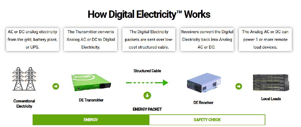 到底什么是 Digital Electricity??Digital Electricity 是為線路供電的系統(tǒng),是一種通過結(jié)構(gòu)化銅線從集中存儲單元為遠(yuǎn)程設(shè)備供電的方案。它不僅可通過輕量級數(shù)據(jù)線安全傳輸高壓電,而且還可為下游電源負(fù)載提供小電流。它是一種原生輸電數(shù)字形式,可視為近 150 年來繼首次利用的 AC 及 DC 格式之后的第三種功率格式。