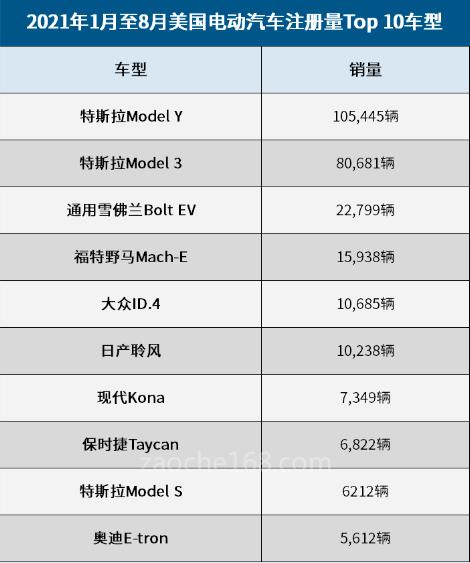 2021年1月至8月,通用雪佛蘭Bolt EV的注冊量為22,799輛,落后于Model Y和Model 3位居第三名。福特野馬Mach-E和大眾ID.4這兩款新上市的車型分別以15,938輛和10,685輛的注冊量位居第四名和第五名。