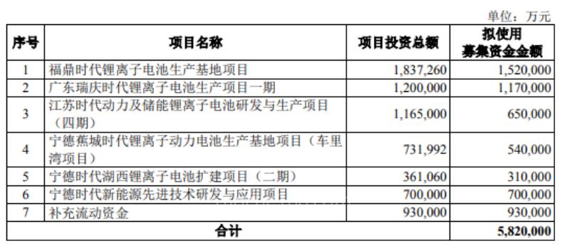582億元定增主要用于福鼎、肇慶、常州、寧德四大基地投建5個項目動力及儲能電池項目建設,合計137GWh,此外還包括30GWh儲能電柜、70億元新技術研發(fā)以及93億元補充流動資金等項目。