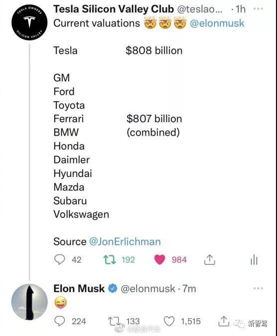 對(duì)于特斯拉的堅(jiān)挺股價(jià),馬斯克也表現(xiàn)的也較為得意。今日,馬斯克轉(zhuǎn)發(fā)了一條推特,其上說(shuō)明,特斯拉當(dāng)前的市值已是豐田、大眾、寶馬、通用等十一家傳統(tǒng)車(chē)企之和。