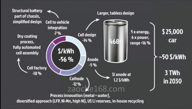 實(shí)際上車(chē)量產(chǎn)后,可提高續(xù)航里程16%,而且在組裝技術(shù)和電池包的全新設(shè)計(jì)下,4680電池每kWh降低了56%的成本??梢哉f(shuō),是全方位超越了有極耳電池。
