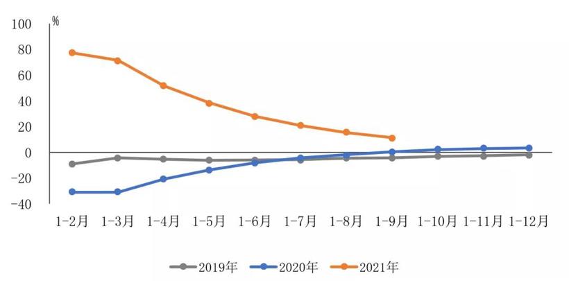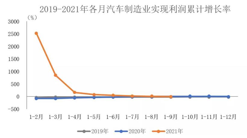 2019-2021年各月汽車制造業(yè)營利潤累計(jì)增長率,圖片來源:中汽協(xié)
