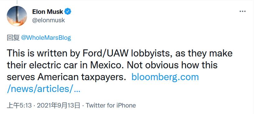 9月,豐田、大眾、現(xiàn)代等12家主要的外國汽車制造商游說民主黨人反對額外的4,500美元工會電動汽車補(bǔ)貼提議,稱該提案歧視那些“選擇不加入工會的美國汽車工人”。特斯拉首席執(zhí)行官埃隆·馬斯克也在推特上表示,該提案是“由福特/美國汽車工人聯(lián)合會的說客提出的……我不清楚這個提案對美國納稅人有什么好處”。