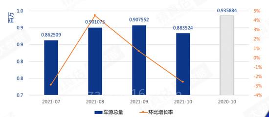 供給制約下,消費(fèi)者不得不迎接漫長(zhǎng)的交付期,部分品牌還需另行支付溢價(jià),許多消費(fèi)者觀望情緒嚴(yán)重,這在客觀上導(dǎo)致置換二手車源減少。數(shù)據(jù)顯示,10月線上車源量降幅為2.6%,已連續(xù)兩個(gè)月環(huán)比下降。