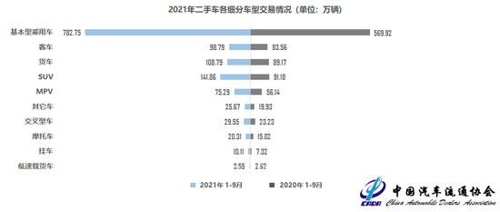 不過今年二手車整體來看仍是大幅增長(zhǎng)態(tài)勢(shì),由于10月二手車銷量還未公布,暫以前9月數(shù)據(jù)代替。今年1-9月,全國(guó)二手車市場(chǎng)累計(jì)交易1296.68萬輛,同比增長(zhǎng)35.34%。其中,轎車共交易782.75萬輛,同比增長(zhǎng)37.34%;客車98.79萬輛,同比增長(zhǎng)18.22%;載貨車108.79萬輛,同比增長(zhǎng)22.01%;SUV 141.86萬輛,同比增長(zhǎng)55.58%;MPV 75.29萬輛,同比增長(zhǎng)34.12%;交叉型乘用車29.55萬輛,同比增長(zhǎng)27.22%。