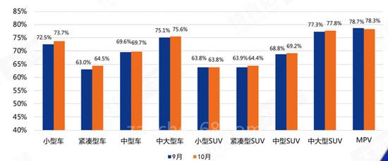 另外,在二手車市場(chǎng),車輛集體“縮量漲價(jià)”的現(xiàn)象已經(jīng)持續(xù)兩個(gè)月,分級(jí)別看,緊湊型轎車10月保值率漲幅最大,環(huán)比上漲1.5個(gè)百分點(diǎn)至64.5%,不過其保值率仍在所有級(jí)別中墊底;MPV車型保值率最高,但近期MPV新車扎堆上市,潛在消費(fèi)者注意力轉(zhuǎn)移至新車,導(dǎo)致MPV二手車價(jià)格小幅下滑。