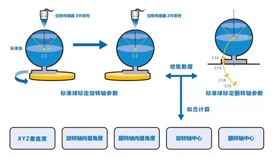 使用雷尼紹標(biāo)準(zhǔn)球,通過(guò)在平臺(tái)不同姿態(tài)下搜索標(biāo)準(zhǔn)球最高點(diǎn)的數(shù)據(jù)和當(dāng)前各軸位置來(lái)擬合并計(jì)算出平臺(tái)的參數(shù)如垂直度、向量、原點(diǎn)中心。