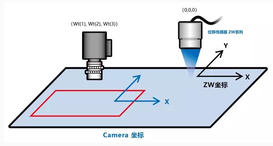由于標(biāo)定使用位移傳感器 ZW系列(以下簡(jiǎn)稱(chēng)“ZW”)作為基準(zhǔn),所以標(biāo)定完的結(jié)果是以ZW焦距位置為WCS原點(diǎn)的。要統(tǒng)一坐標(biāo)系,就要統(tǒng)一相機(jī)焦距中心和ZW焦距之間的關(guān)系以及統(tǒng)一膠閥和ZW焦距之間的關(guān)系。