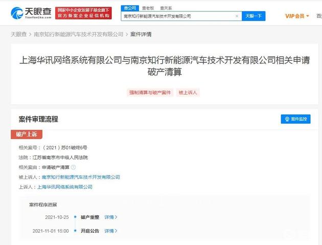 事實上,早在7月12日,南京知行新能源汽車技術(shù)開發(fā)有限公司新增破產(chǎn)重整信息,案號為(2021)蘇0113破申26號,經(jīng)辦法院為南京市棲霞區(qū)人民法院,申請人為上海華訊網(wǎng)絡(luò)系統(tǒng)有限公司。