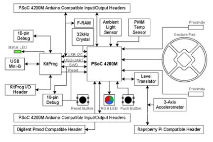 此外,本方案還提供了Arduino接口、6 pin Digilent PMOD模塊以及兩個(gè)CapSense 接近接頭和一個(gè)CapSense手勢(shì)板,并集成了環(huán)境光傳感器、3軸加速度計(jì)、PWM溫度傳感器、RGB LED、按鈕開關(guān)、板載編程/調(diào)試器和USB-UART/I2C橋接功能模塊和Cypress F-RAM等,支持3.3V或5V的工作電壓,滿足設(shè)計(jì)需求。