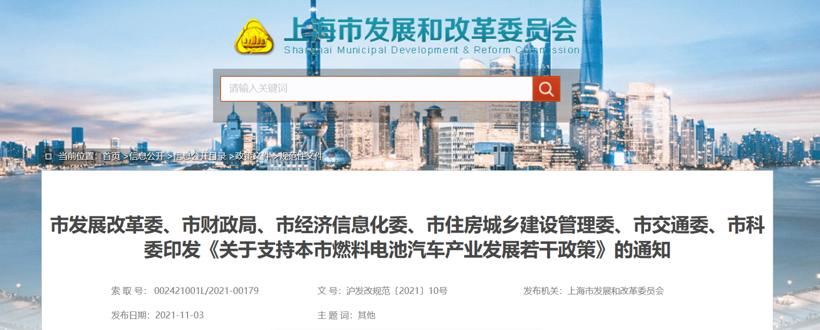 2021年11月3日,上海市發(fā)展改革委、市財政局等相關部門印發(fā)了《關于支持本市燃料電池汽車產業(yè)發(fā)展若干政策》(以下簡稱《若干政策》)的通知。