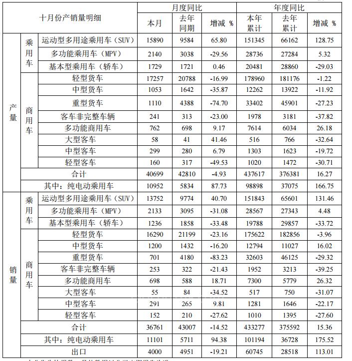分車型來看,上個(gè)月MPV和轎車銷量均出現(xiàn)了較大幅度的下滑。其中MPV 10月銷量為2133輛,同比大幅下跌31.08%;1-10月MPV總銷量為28,567輛,同比增長4.48%;轎車10月銷量為1,236輛,同比下滑33.48%;1-10月轎車共計(jì)賣出了19,788 輛,同比下跌33.72%。SUV車型作為銷售主力,10月銷量達(dá)13,752輛,同比增長40.7%;1-10月累計(jì)銷售15.2萬輛,同比大幅增長131.5%。