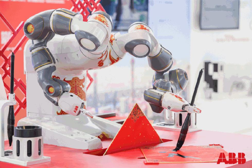 例如ABB YuMi雙臂協(xié)作機器人化身“書法家”,蘸墨、舔筆、揮毫在行云流水之間完成,能將觀眾現(xiàn)場寫下的多種字體的毛筆字,惟妙惟肖地進行重現(xiàn)。這一展示集成了機器人、視覺慣性里程計同步定位技術和AI圖像技術和機器學習,展示了協(xié)作機器人的無限應用潛能。