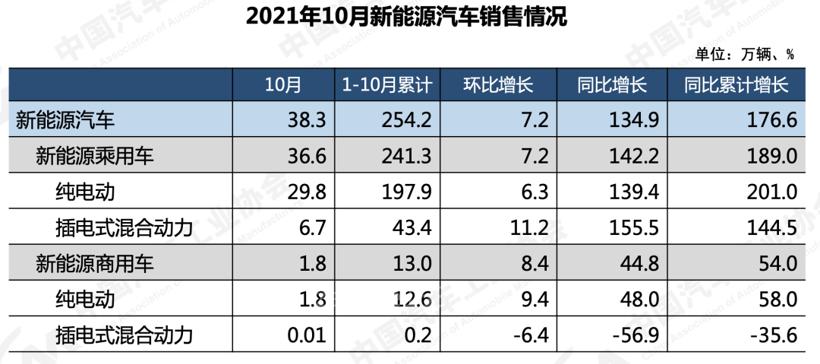 中汽協(xié)數(shù)據(jù)顯示,10月份新能源汽車產(chǎn)銷量再創(chuàng)新高,分別達到了39.7萬輛和38.3萬輛,環(huán)比增長12.5%和7.2%,同比增長均為1.3倍。1-10月,新能源汽車產(chǎn)銷分別達到256.6萬輛和254.2萬輛,同比增長均達到1.8倍。