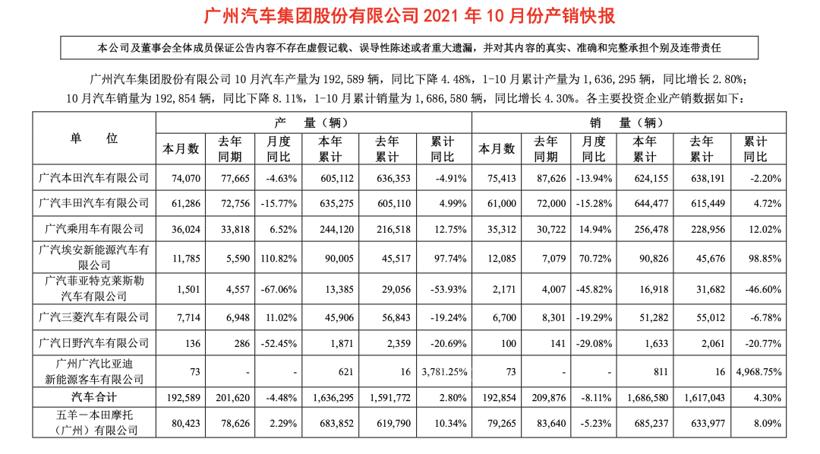 廣汽集團增長乏力,主要是合資板塊的“雙田”受芯片短缺等影響,銷量表現(xiàn)不佳。10月,廣汽本田銷量為7.54萬輛,同比下降13.9%;廣汽豐田銷量為6.1萬輛,同比下滑15.3%。不過,因9月份銷量基數(shù)較低,“兩田”環(huán)比均出現(xiàn)上漲。