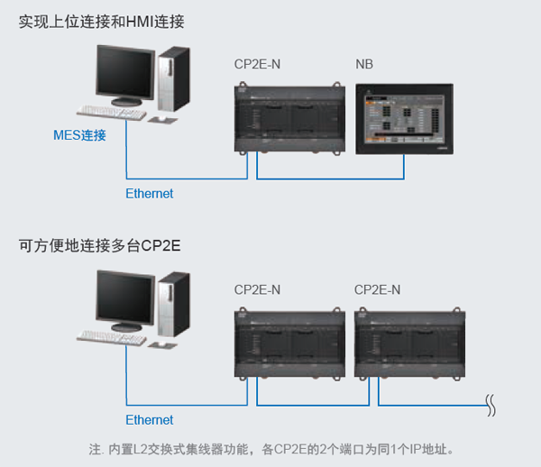 將裝置連接至網(wǎng)絡(luò),可收集現(xiàn)場信息。此外,配備2個Ethernet端口,無需交換式集線器,除了上位連接,另一端還可用作HMI和PLC的連接、工具連接用端口和預(yù)備端口等,使用方法多樣。