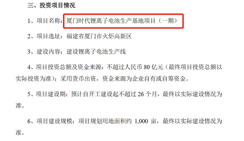 根據(jù)公告信息,廈門項(xiàng)目位于福建省廈門市火炬高新區(qū),規(guī)劃用地面積約1000畝,建設(shè)期預(yù)計(jì)不超過26個(gè)月,主要建設(shè)鋰離子電池生產(chǎn)線,項(xiàng)目投資主體為廈門時(shí)代新能源科技有限公司。